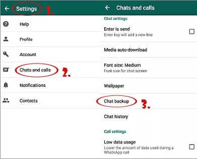 Εκτελέστε πρώτα την εφαρμογή WhatsApp στο τηλέφωνό σας Android. Στη διεπαφή, μεταβείτε στις "Ρυθμίσεις". Στη συνέχεια, στη λίστα, πατήστε "Chat" και επιλέξτε "Chat backup" για να δημιουργήσετε αντίγραφα ασφαλείας των συνομιλιών WhatsApp στο τηλέφωνό σας Android.