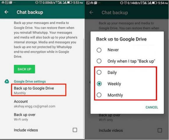 Επιλέξτε "Δημιουργία αντιγράφων ασφαλείας στο Google Drive" από το παράθυρο δημιουργίας αντιγράφων ασφαλείας της συνομιλίας και επιλέξτε πόσο συχνά θα δημιουργείτε αντίγραφα ασφαλείας στο Google Drive. Για να ξεκινήσετε τη δημιουργία αντιγράφων ασφαλείας του WhatsApp, κάντε κλικ στο «Δημιουργία αντιγράφων ασφαλείας».