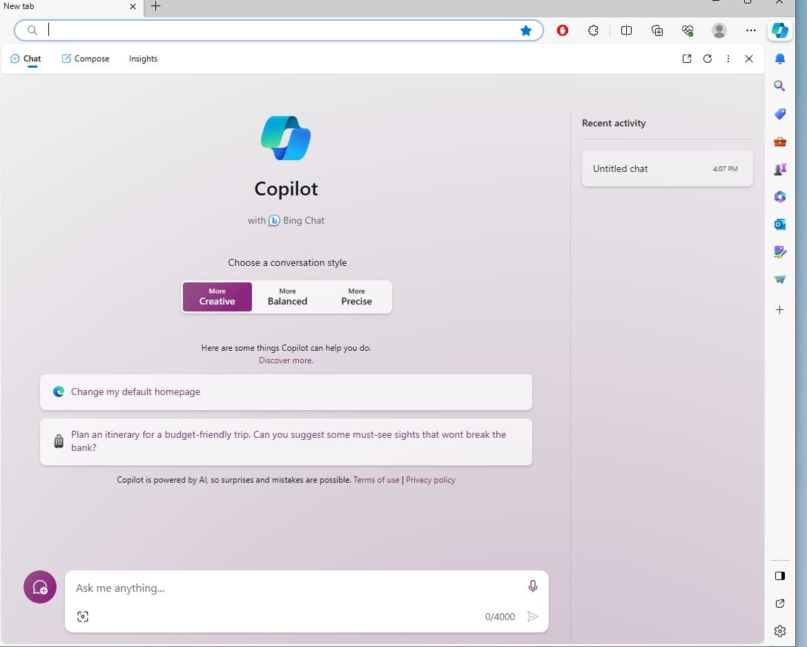 Το Edge Copilot βασίζεται στη συνομιλία Bing. Προς τη χρήσηChatgpt 4 στην άκρη δωρεάν, πρέπει να επιλέξετε τον "δημιουργικό" τρόπο Copilot Edge. Στη συνέχεια, μπορείτε να εισαγάγετε την προτροπή ή την ερώτησή σας στο πλαίσιο συνομιλίας και περιμένετε να απαντήσει ο Bing. Το Bing θα χρησιμοποιήσει το ChatGpt 4 για να δημιουργήσει μια απάντηση που είναι ενδιαφέρουσα, διασκεδαστική και συναρπαστική.