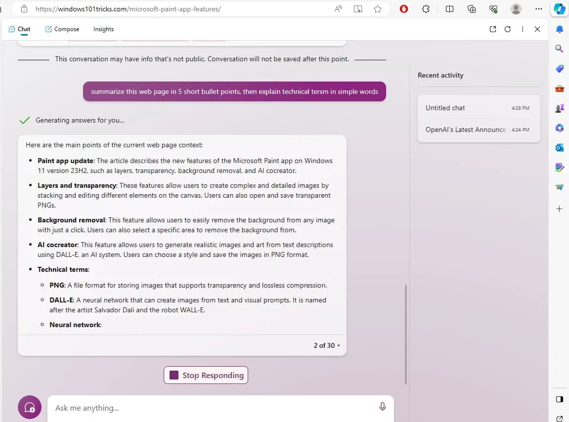 Ακολουθεί ένα παράδειγμα του τρόπου με τον οποίο ο Bing συνοψίστηκε και εξήγησε αυτήν την ιστοσελίδα: https://windows101tricks.com/microsoft-paint-app-features/