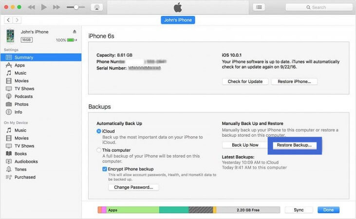 - Υποστήριξη άμεσης ανάκτησης από το iCloud, το iTuns και άλλο λογισμικό εφεδρικών αντιγράφων ασφαλείας, υποστηρίζουν επίσης την αποκατάσταση αντιγράφων ασφαλείας.