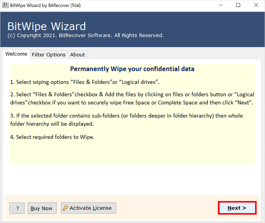 Γι 'αυτό χρησιμοποιείBitrecoverΣκούπισμα δεδομένων, ένα εργαλείο που έχει σχεδιαστεί για να διαγράψει με ασφάλεια τα αρχεία με ελεύθερο χώρο MFT και να καθαρίσετε με ασφάλεια την αποθήκευση σας, είναι η τελική λύση.