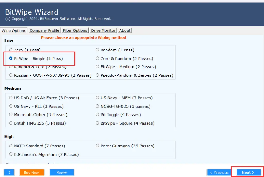 6. ΚλικΕπόμενοςκαι επιλέξτε "ΕΠΙΛΟΓΗ Σκουπίστε"Π.χ., Bitwipe- Simple (Pass 1)