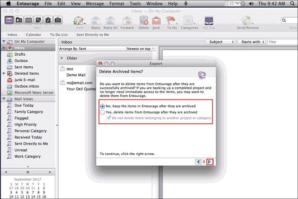 Βήμα 4.Στη συνέχεια, όταν το μήνυμα ηλεκτρονικού ταχυδρομείου, χτυπήστε "Ναι, διαγράψτε αντικείμενα από το Entourage μετά την αρχειοθέτησή τους ".