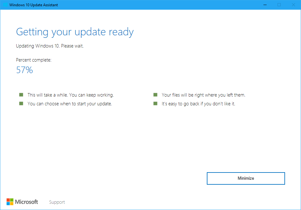 "Μόλις ολοκληρωθεί η λήψη και η ενημέρωση των χαρακτηριστικών είναι έτοιμη για εγκατάσταση, θα σας ειδοποιήσουμε, ώστε να μπορείτε να επιλέξετε μια βολική στιγμή για να ολοκληρώσετε την εγκατάσταση και να επανεκκινήσετε τη συσκευή σας, εξασφαλίζοντας ότι η ενημέρωση δεν διαταράσσει τις δραστηριότητές σας".