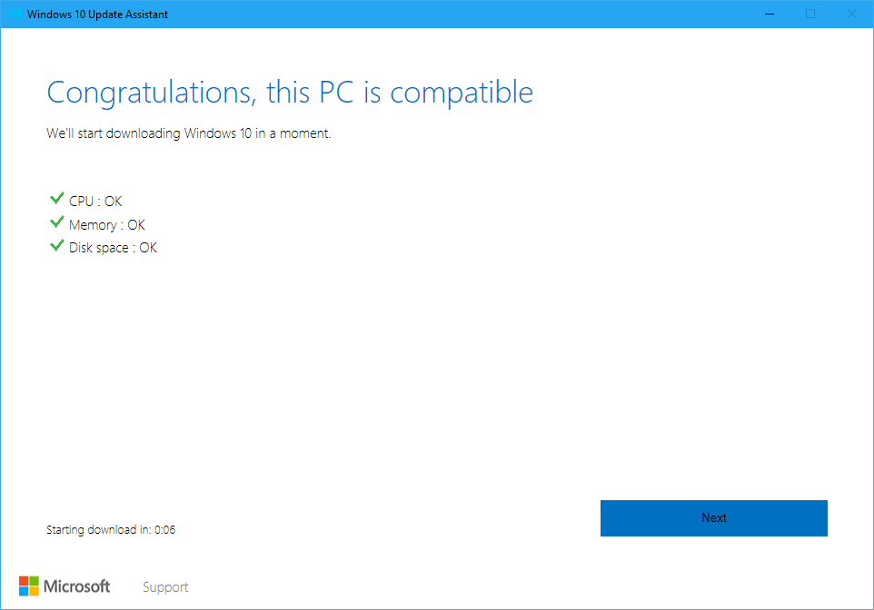 Εάν το σύστημα του υπολογιστή σας περάσει όλους τους ελέγχους συμβατότητας, θα δείτε μια οθόνη επιτυχίας όπως φαίνεται παραπάνω. Τώρα κάντε κλικ στο κουμπί Επόμενο Η πραγματική λήψη θα ξεκινήσει λίγα λεπτά μετά την εμφάνιση αυτής της οθόνης. Μια αντίστροφη μέτρηση θα εμφανιστεί στην κάτω αριστερή γωνία της οθόνης.