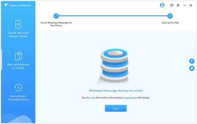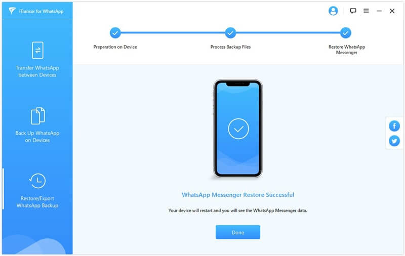Αυτό είναι! Με το Itransor, η αποκατάσταση των δεδομένων σας WhatsApp είναι ένα αεράκι. Είτε μεταβείτε σε μια νέα συσκευή είτε απλά πρέπει να αποκαταστήσετε κάποια χαμένα δεδομένα, το Itransor σας καλύπτει. Στην επόμενη ενότητα, θα διερευνήσουμε τον τρόπο μεταφοράς δεδομένων WhatsApp μεταξύ συσκευών iOS και Android με το ITRANSOR.