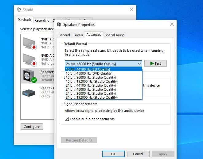 - Μετακινηθείτε στην καρτέλα Advanced, επιλέξτε ένα διαφορετικό ρυθμό ήχου ως προεπιλεγμένη μορφή