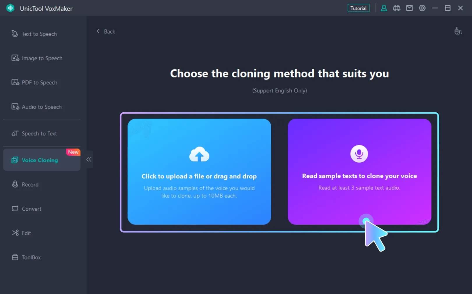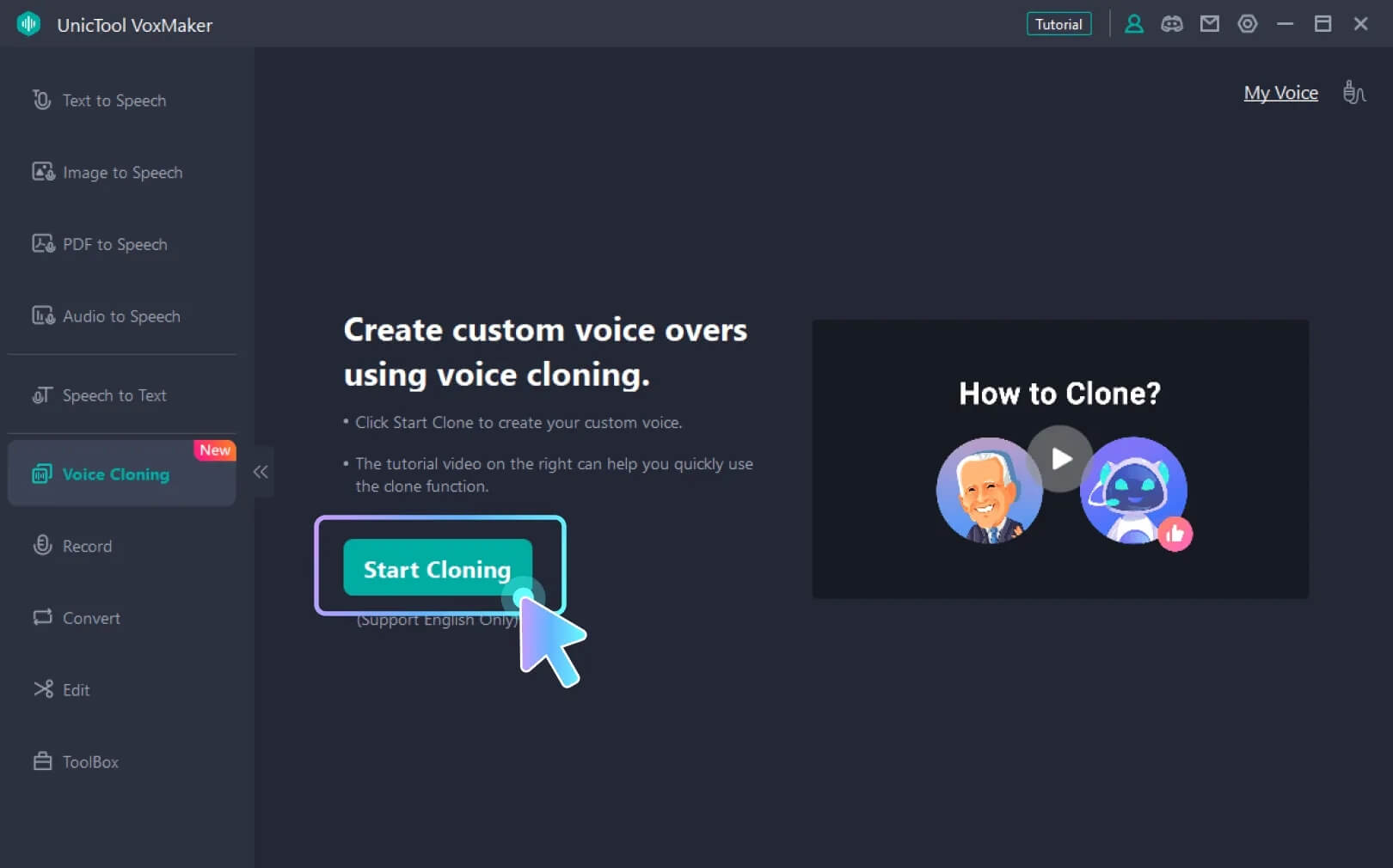 - Βήμα 2:Επιλέξτε "Κλωνοποίηση φωνής", και στη συνέχεια περιβάλλον εγγραφής ανίχνευσης.