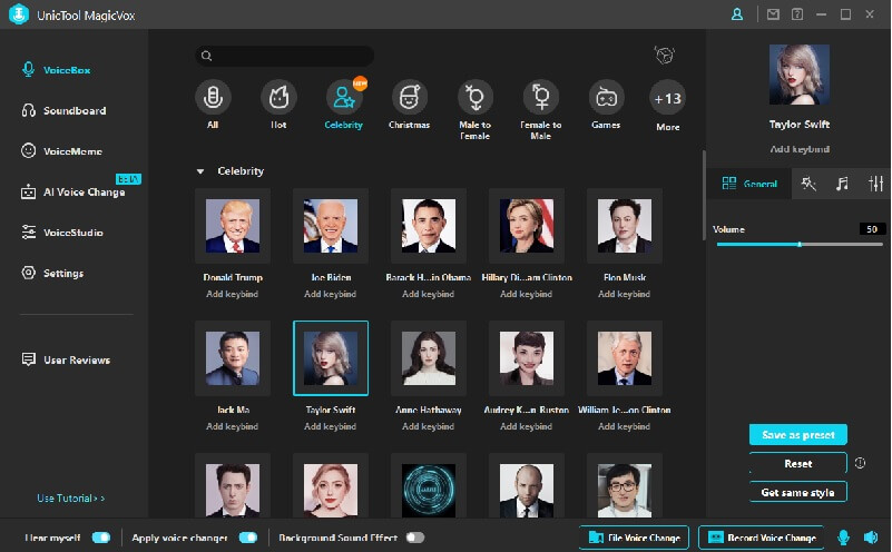 - Η δυνατότητα μεταβολής της φωνής σε πραγματικό χρόνο με μια τεράστια επιλογή πάνω από 400 φίλτρα φωνής.