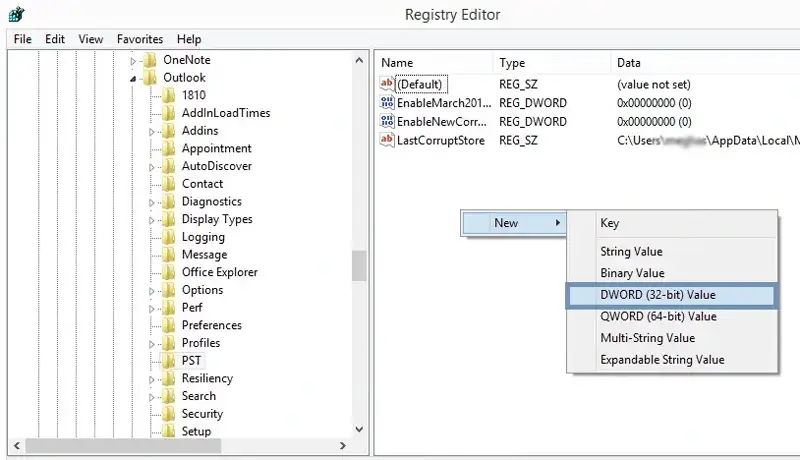 2. Μεταβείτε στο: HKEY_CURRENT_USER \ Software \ Microsoft \ Office \ 16.0 \ Outlook \ Options \ Mail