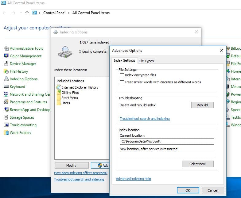 Εάν τα ζητήματα εξακολουθούν να υπάρχουν αφού έχετε εγκαταστήσει την τελευταία κατασκευή, ίσως χρειαστεί να ξεκινήσετε τις επιλογές ευρετηρίασης για να διορθώσετε πλήρως το ζήτημα: