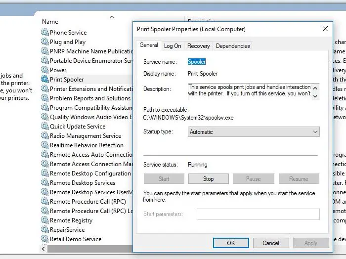 - Ανοίξτε και πάλι το πλαίσιο διαλόγου Spooler εκτυπωτή και εντοπίστε την υπηρεσία εκτύπωσης.