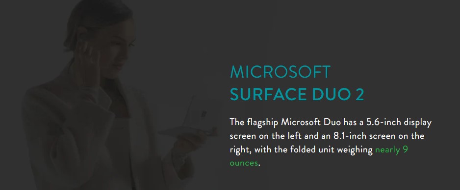 Οναυαρχίδα Microsoft DuoΈχει οθόνη οθόνης 5,6 ιντσών στα αριστερά και οθόνη 8,1 ιντσών στα δεξιά, με την διπλωμένη μονάδα να ζυγίζει σχεδόν 9 ουγγιές. Αντί για τις τυποποιημένες μπροστινές και πίσω κάμερες, είχε έναν προσαρμοστικό φακό 11MP που προσφέρθηκε με μπροστινή προσφορά εξοπλισμένου με διάφορες λειτουργίες και πορτρέτο, καθώς και βίντεο 4K στα 30 και 60 καρέ ανά δευτερόλεπτο. Κοστίζει περίπου 1.400 δολάρια.