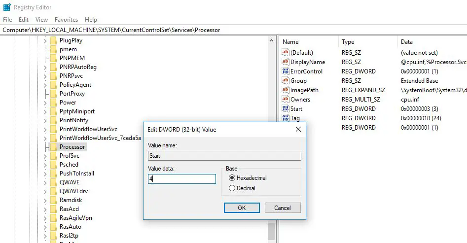 Κάντε διπλό κλικ στην αρχή και ρυθμίστε την τιμή 4, κλείστε τον επεξεργαστή μητρώου και επανεκκινήστε τον υπολογιστή σας.