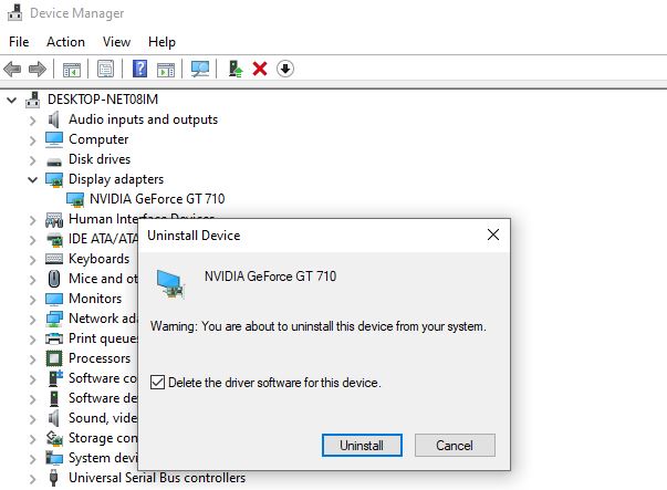 Ανοίξτε τη Διαχείριση Συσκευών και αναπτύξτε το πρόγραμμα οδήγησης οθόνης. Κάντε δεξί κλικ στο εγκατεστημένο πρόγραμμα οδήγησης NVIDIA, επιλέξτε απεγκατάσταση και επανεκκίνηση του υπολογιστή σας.