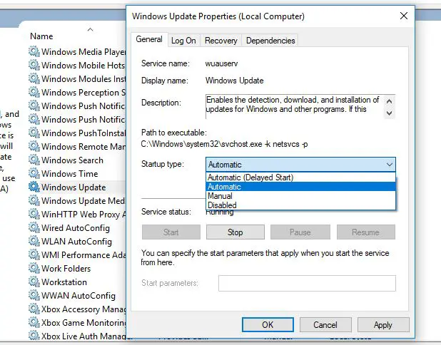- Αλλάξτε τον τύπο εκκίνησης σε αυτόματο από τη λίστα, κάντε κλικ στο κουμπί Έναρξη κάτω από την κατάσταση της υπηρεσίας,