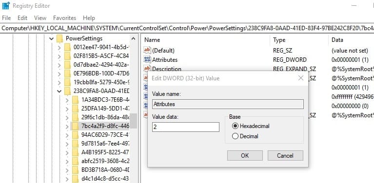 Εδώ η πρώτη βάση δεδομένων μητρώου αντιγράφων ασφαλείας και μετά περιηγηθείτε στο HKEY_LOCAL_MACHINESYSTEMCURRENTCONTROLSETCONTROLPOWERSETTINGITING238C9FA8-0AAD-41ED-83F4-97BE242C8F207BC4A2F9-D8FC-469-B07B-333EB785AACAA0