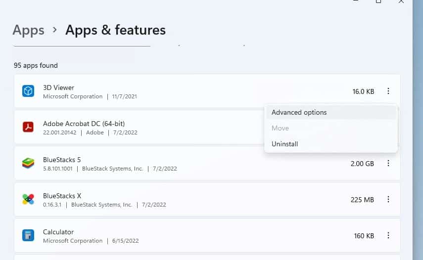 - Εδώ θα βρείτε μια λίστα εφαρμογών, απλά κάντε κλικ στο εικονίδιο μενού τριών σημείων δίπλα στην εφαρμογή που θέλετε να απενεργοποιήσετε από το να εκτελείτε στο παρασκήνιο και να επιλέξετε προηγμένες επιλογές,