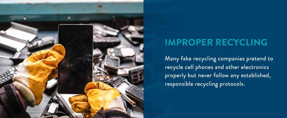 Πολλές ψεύτικες εταιρείες ανακύκλωσης προσποιούνται ότι ανακυκλώνουν σωστά τα κινητά τηλέφωνα και άλλα ηλεκτρονικά, αλλά ποτέ δεν ακολουθούν κανένα καθιερωμένο, υπεύθυνο πρωτόκολλα ανακύκλωσης. Αντί να ακολουθούν τους κανόνες, αυτές οι εταιρείες κάνουν τα χρήματά τους συλλέγοντας τα ηλεκτρονικά απόβλητα και την αποστέλλοντάς τους σε scraphyards σε χώρες όπως η Ινδία, το Πακιστάν, η Γκάνα και η Κίνα.