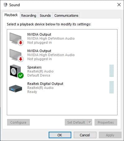 Εάν αυτό δεν λειτουργεί, επιλέξτε Ακύρωση και, στην καρτέλα αναπαραγωγής, επιλέξτε μια άλλη προεπιλεγμένη συσκευή (εάν έχετε ένα). Επιλέξτε το πλαίσιο ελέγχου απενεργοποίησης όλων των βελτιώσεων και προσπαθήστε να παίξετε ξανά τον ήχο. Κάντε αυτό για κάθε προεπιλεγμένη συσκευή.