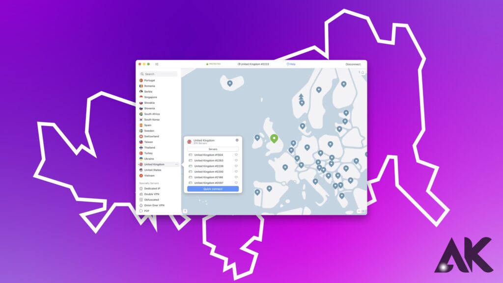 - Επιλέξτε έναν διακομιστή του Ηνωμένου Βασιλείου:Οι περισσότερες εφαρμογές VPN διαθέτουν μια λίστα τοποθεσιών διακομιστών, οι οποίες συχνά ανιχνεύονται ή περιπλανιούνται από έναν χάρτη.