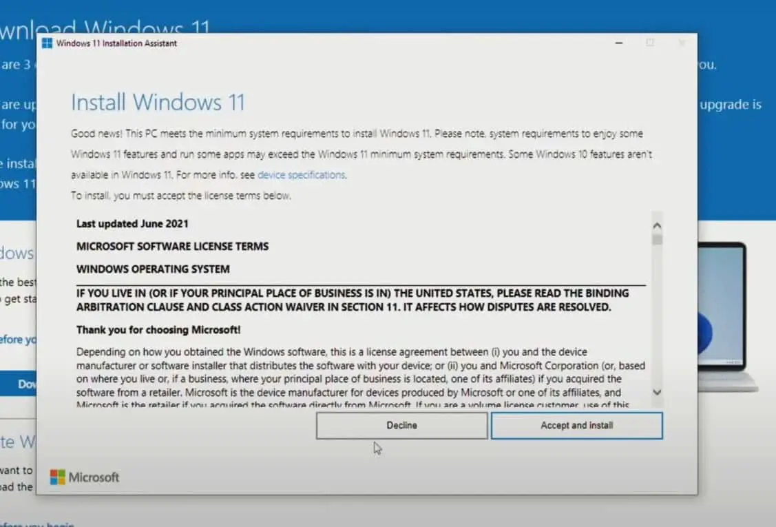 - Αυτό θα αντιπροσωπεύει τη συμφωνία άδειας χρήσης για εσάς, βεβαιωθείτε ότι έχετε διαβάσει αυτό το συμφωνητικό εγκατάστασης των Windows 11 και αφού ολοκληρώσετε, προχωρήστε και πατήστε το κουμπί αποδοχή και εγκατάσταση.