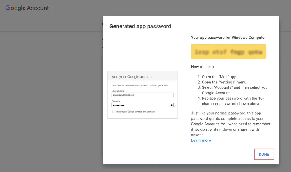 - ΕΝΑ16 ψηφιακός κωδικός πρόσβασηςέχει δημιουργηθεί με επιτυχία για τον λογαριασμό σας στο Google.