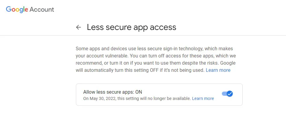 Μετά τη δήλωση Google, "λιγότερο ασφαλείς εφαρμογές δεν λειτουργούν σωστά". Εάν επιτρέψουμε στο LSA να συνδεθεί με άλλους πελάτες ηλεκτρονικού ταχυδρομείου, θα δείξει το μήνυμα ότι "οι λιγότερο ασφαλείς ρυθμίσεις πρόσβασης εφαρμογών δεν θα είναι πλέον διαθέσιμες μετά τις 30 Μαΐου 2022." Έχω απλώς την αίσθηση ότι κάποια απροσδόκητα πράγματα θα αρχίσουν να συμβαίνουν όταν το Google το κλείνει αυτό.