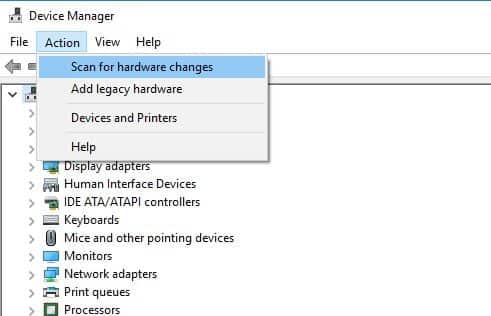 Εάν όχι, ανοίξτε ξανά τη Διαχείριση Συσκευών και κάντε κλικ στο ΕνέργειαΣάρωση για αλλαγές υλικού,και ελέγξτε αν το πρόβλημα έχει επιλυθεί ή όχι.