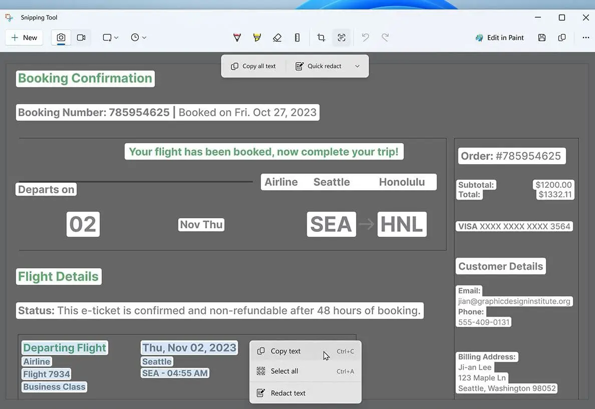 Επιπλέον, η τελευταία έκδοση του εργαλείου Snipping εισάγει υποστήριξη αναγνώρισης κειμένου μέσω μιας νέας λειτουργίας "ενεργειών κειμένου". Αυτό επιτρέπει στους χρήστες να αντιγράφουν αβίαστα και να επαναπροσδιορίζουν το κείμενο απευθείας από ένα στιγμιότυπο οθόνης, παρέχοντας ένα ισχυρό εργαλείο για τη διαχείριση του περιεχομένου κειμένου μέσα σε εικόνες.