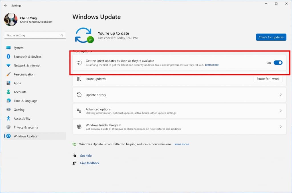 Για να λάβετε την ενημέρωση διαμόρφωσης των Windows, πρέπει πρώτα να πάτεΡυθμίσεις>Ενημέρωση των Windows, Ενεργοποιήστε το 'Λάβετε τις τελευταίες ενημερώσεις μόλις είναι διαθέσιμες«Ρύθμιση και, στη συνέχεια, κάντε κλικ στο»Ελέγξτε για ενημερώσειςκουμπί.