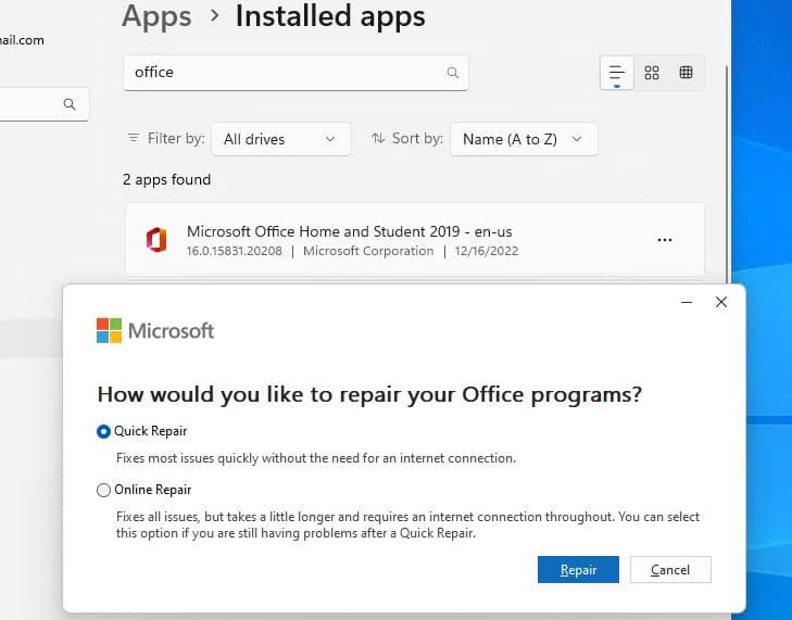 - Επισκευάστε την εγκατάσταση του Office: Μεταβείτε στις Ρυθμίσεις> Εφαρμογές> Εφαρμογές & Χαρακτηριστικά, επιλέξτε Microsoft 365 και κάντε κλικ στο Modify> Γρήγορη επισκευή ή ηλεκτρονική επισκευή.