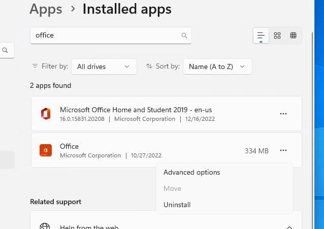 - Πλοηγηθείτε στις εφαρμογές και στη συνέχεια εγκαταστήστε την εφαρμογή μετακινηθείτε προς τα κάτω για να εντοπίσετε ένα γραφείο, κάντε κλικ στο μενού τριών σημείων και επιλέξτε Προχωρημένες επιλογές από το μενού.