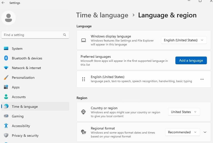 - Μεταβείτε στην ενότητα Γλώσσα και περιοχή και ελέγξτε εάν έχετε ορίσει σωστά τη χώρα ή την περιοχή.
