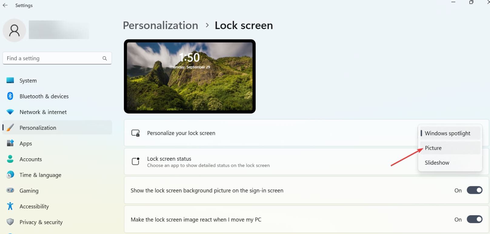 - Απενεργοποιήστε τον διακόπτη δίπλα στην επιλογή Εμφάνιση εικόνας φόντου οθόνης κλειδώματος στην οθόνη σύνδεσης και επιλέξτε Εικόνα από το αναπτυσσόμενο μενού φόντου.