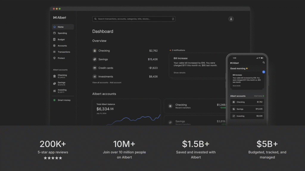 Χρησιμοποιείται από πάνω από 10 εκατομμύρια άτομα, ο Albert παρακολούθησε πάνω από 50 εκατομμύρια συναλλαγές. ΤουΈξυπνος αλγόριθμος χρημάτωνΔημιουργεί προσαρμοσμένους προϋπολογισμούς, εξοικονομεί αυτόματα χρήματα και μπορεί να βοηθήσει στην επένδυση. Οι χρήστες μπορούν να λάβουν προκαταβολές σε μετρητά μέχρι $ 250.