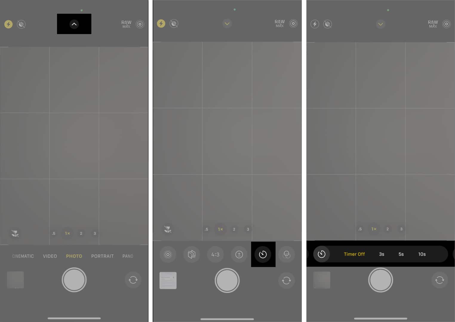 Για να χρησιμοποιήσετε χρονοδιακόπτη κάμερας iPhone, ανοίξτε τοΚάμεραεφαρμογή και σύρετε επάνω. Τώρα, στο νέο δίσκο των επιλογών, πατήστε στομετρών την ώρανεικόνισμα. Μπορείτε τώρα να επιλέξετε μεταξύ3S,5ος, ήΚαθυστέρηση 10S. Ρυθμίστε το πλάνο σας, χτυπήστε το κουμπί κλείστρου και η κάμερα θα μετρήσει πριν τραβήξετε τη φωτογραφία.