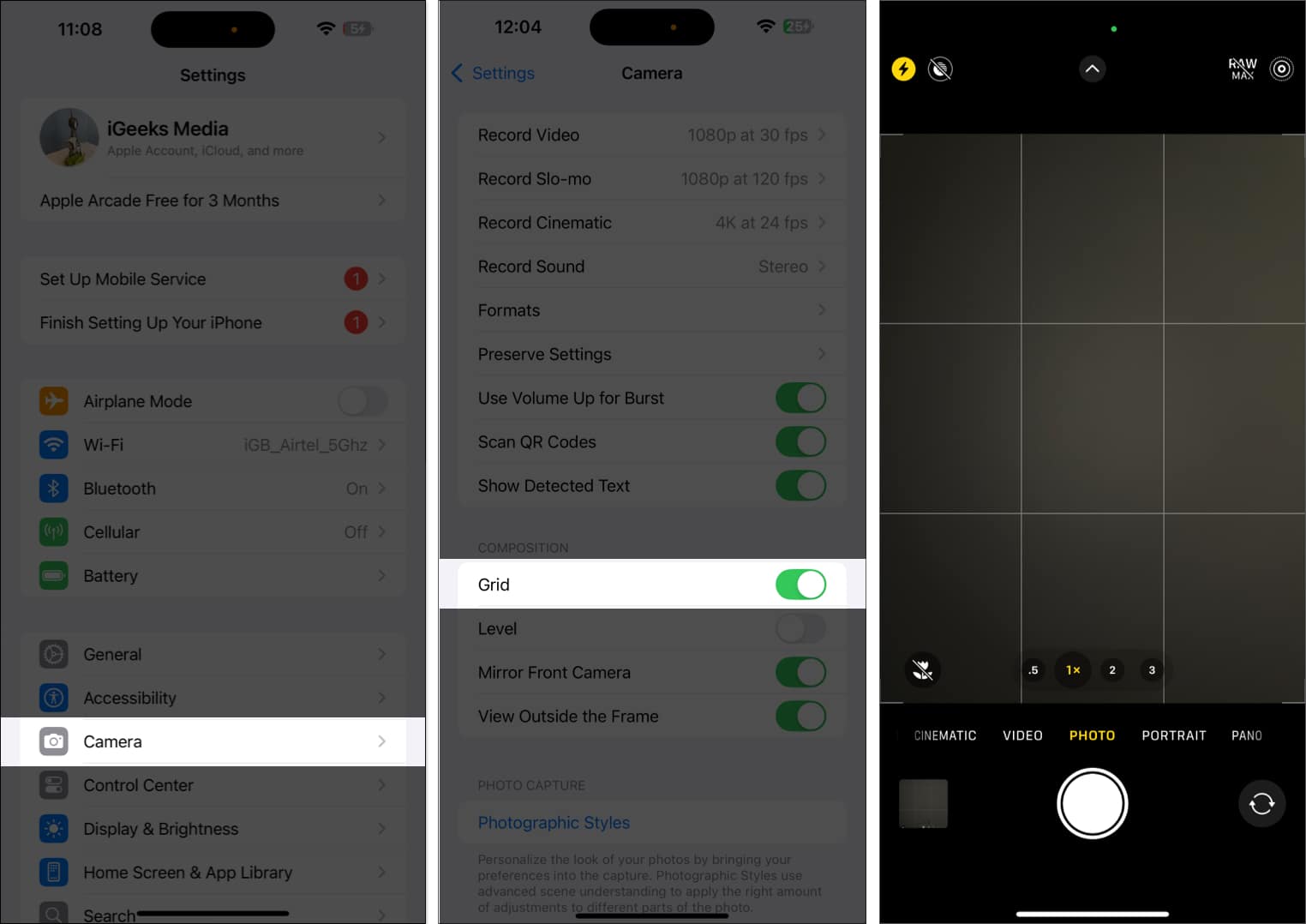 Για να ενεργοποιήσετε τις γραμμές του πλέγματος, κατευθυνθείτε προςΡυθμίσεις→Κάμερακαι εναλλαγήΠλέγμα. Τώρα, όταν ανοίγετε την εφαρμογή της κάμερας, θα δείτε μια επικάλυψη πλέγματος για να σας βοηθήσουμε να συνθέσετε ισορροπημένες και επαγγελματικές πλάκες.