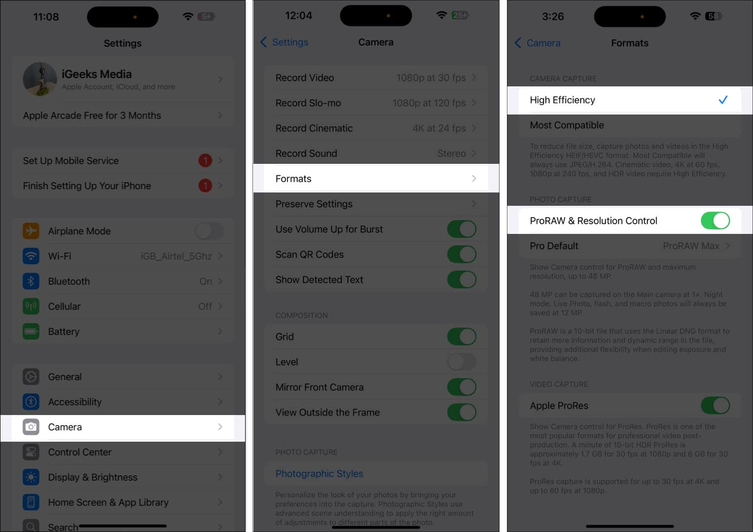 Μπορείτε να κατευθυνθείτε προςΡυθμίσεις→Κάμερα→Μορφές. Εδώ, μπορείτε να αλλάξετε το Proraw για επαγγελματική επεξεργασία ή HEIF για καθημερινές φωτογραφίες.