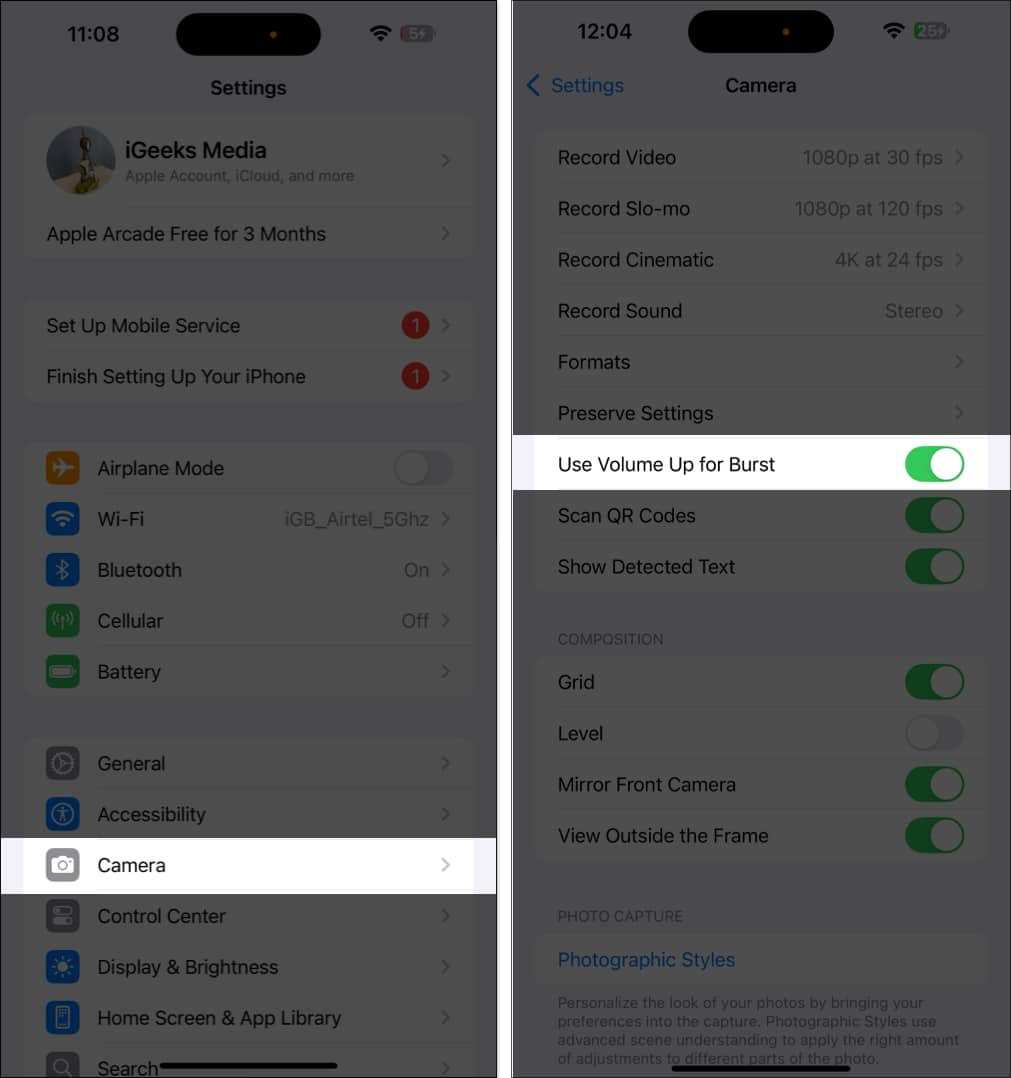 Εναλλακτικά, μπορείτε να κατευθυνθείτεΡυθμίσεις→Κάμερακαι να ενεργοποιήσετε την εναλλαγή δίπλαΧρησιμοποιήστε την ένταση για έκρηξη. Μόλις τελειώσετε, επιστρέψτε στην εφαρμογή της κάμερας. Τώρα μπορείτε να πατήσετε και να κρατήσετε το κουμπί Volume Up για να τραβήξετε εύκολα πολλαπλές λήψεις.