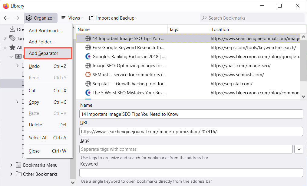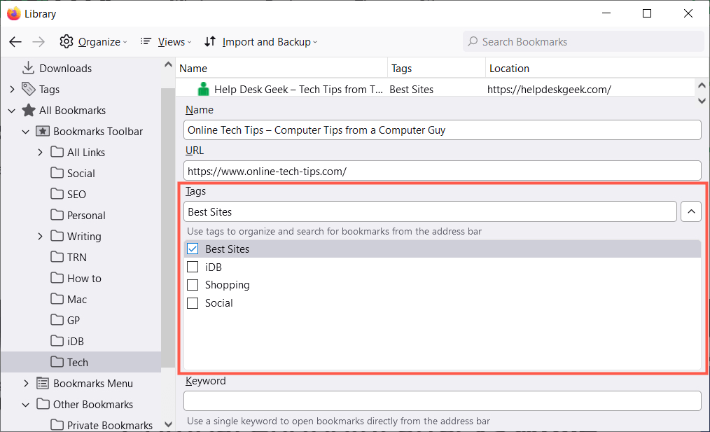 Μια εναλλακτική λύση στη χρήση ετικετών στον Firefox είναι η χρήση λέξεων -κλειδιών. Μπορείτε να εισαγάγετε αυτές τις ετικέτες, όταν προσθέτετε ένα σελιδοδείκτη ή στη βιβλιοθήκη. Απλά εισαγάγετε τη λέξη -κλειδί ή τη φράση στοΛέξεις -κλειδιάπεδίο.