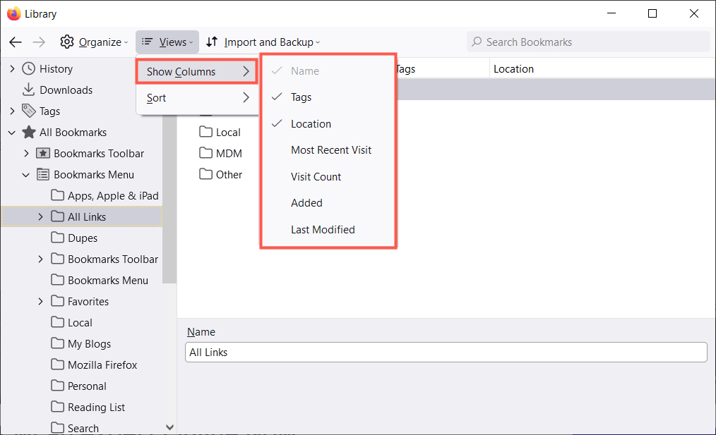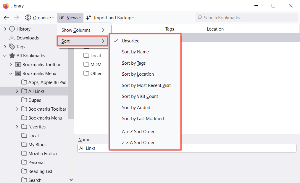 Στη συνέχεια, μπορείτε να ταξινομήσετε τους σελιδοδείκτες χρησιμοποιώντας το ίδιοΘέακουμπί στη γραμμή εργαλείων. Επιλέξτε μια επιλογή ταξινόμησης από το μενού pop-out. Εναλλακτικά, μπορείτε να επιλέξετε μια κεφαλίδα στήλης για να ταξινομήσετε με τη συγκεκριμένη στήλη.