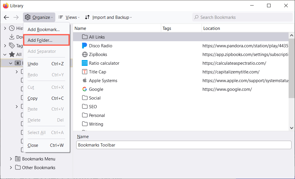 ΕπιλέγωΣελιδοδείκτεςαπό το μενού και επιλέξτεΔιαχείριση σελιδοδεικτών. Η βιβλιοθήκη ανοίγει σε ένα αναδυόμενο παράθυρο.