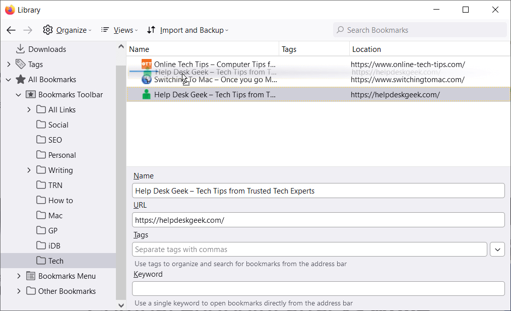 Με το παράθυρο της βιβλιοθήκης ανοιχτό, μπορείτε να οργανώσετε τους σελιδοδείκτες αναδιατάσσοντάς τα. Αυτό σας βοηθά να βρείτε αυτά που χρησιμοποιείτε συχνότερα τοποθετώντας τα στην κορυφή της λίστας ή εκείνων που σπάνια χρησιμοποιείτε στο κάτω μέρος.
