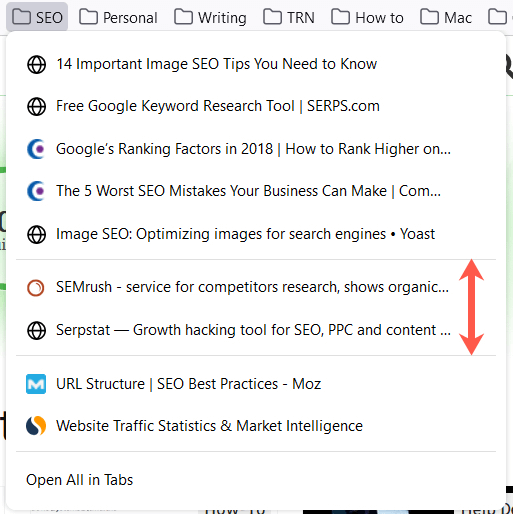- ΕπιλέγωΣελιδοδείκτεςαπό το μενού και επιλέξτεΤρέχουσα καρτέλα σελιδοδείκτηήΣελιδοδείκτη όλων των καρτέλες.