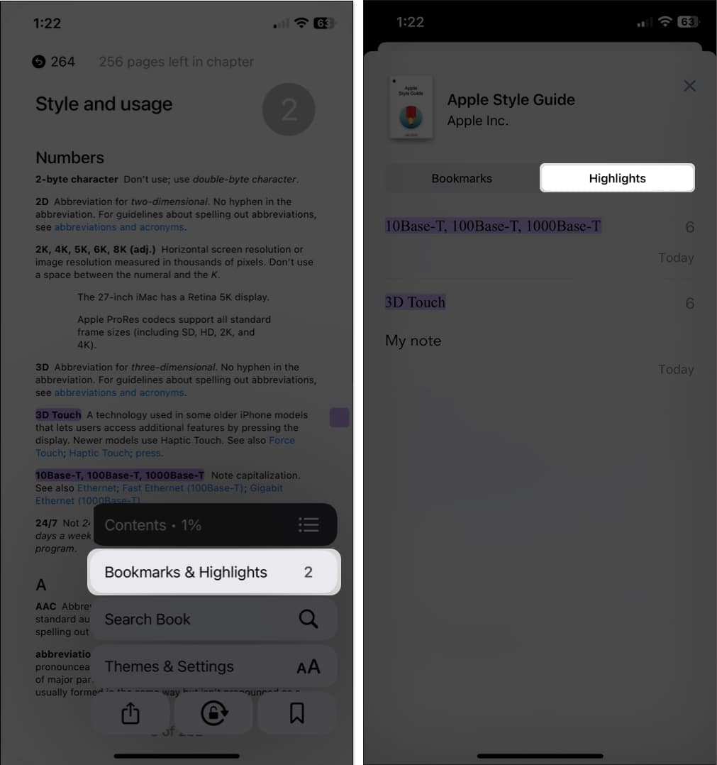 Θα δείτε και τα δύο highlights και τις σημειώσεις στο βιβλίο. Παρόλο που και οι δύο δείχνουν το επισημασμένο κείμενο, μια σημείωση εμφανίζει επίσης ένα μικρό τετράγωνο στο πλάι της σελίδας που μπορείτε να πατήσετε για να δείτε τη σημείωση.