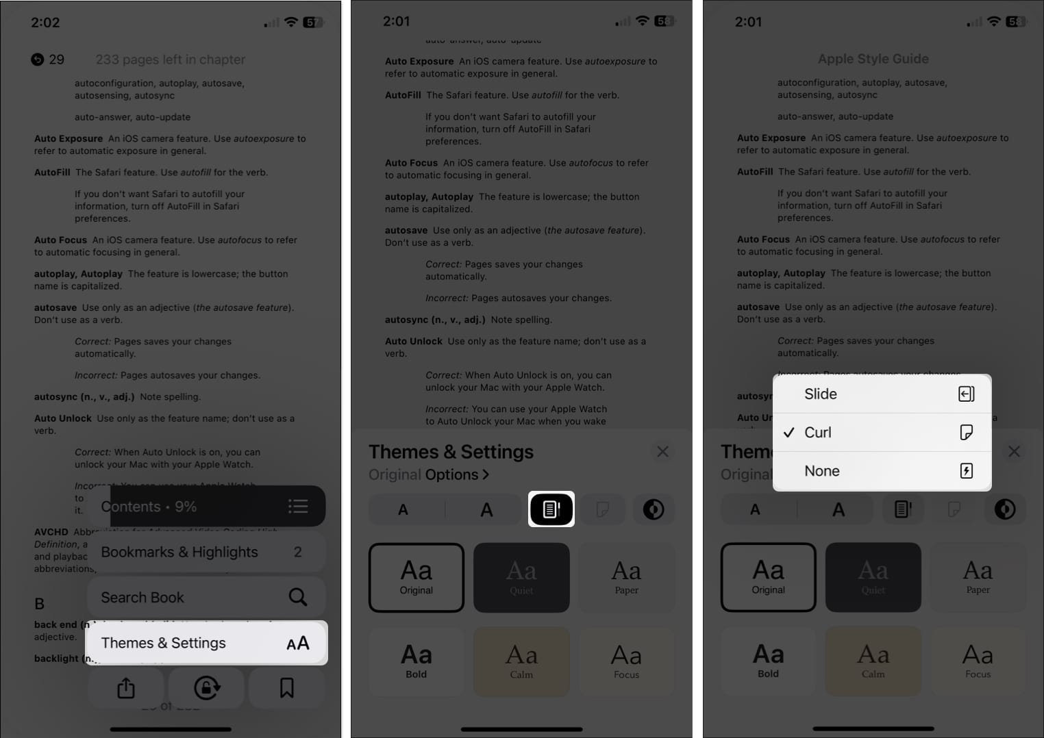 Για να βελτιώσετε την εμπειρία στην εφαρμογή Books, μπορείτε να προσαρμόσετε την εμφάνιση όταν διαβάζετε. Ξεκινώντας από το στυλ στροφής της σελίδας που αναφέρεται παραπάνω, μπορείτε να επιλέξετε ένα θέμα, να ρυθμίσετε τη φωτεινότητα, να αλλάξετε τη γραμματοσειρά, να κλειδώσετε τον προσανατολισμό και πολλά άλλα.