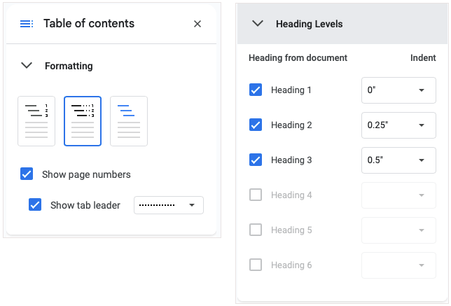 - Επίπεδα επικεφαλίδας: Επιλέξτε τις επικεφαλίδες που θέλετε να εμφανίσετε στον πίνακα και προσαρμόστε προαιρετικά τις αναφορές.