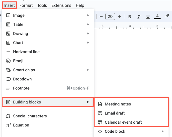 Για να εισαγάγετε ένα δομικό στοιχείο, επιλέξτε μια τοποθεσία στο έγγραφό σας και μεταβείτε στοΕισάγω>Δομικά στοιχεία. Επιλέξτε τον τύπο που θέλετε να χρησιμοποιήσετε από το μενού pop-out.